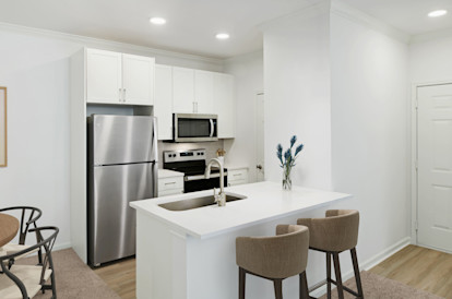 Newly renovated apartment homes feature white shaker cabinetry, white quartz countertops, gray subway tile backsplash, modern fixtures, and white trim. Each kitchen features brushed nickel hardware, stainless steel appliances, and deep undermount sinks with pull-down sprayer faucets. Full-size washers and dryers, 9-foot ceilings with crown molding, and modern ceiling fans complete every home. Floor plans that include extensive balconies and flex spaces allow you to create an at-home oasis or set up the perfect work from home spot. Select apartments feature attached garages, hardwood-style flooring throughout, and built-in shelves and desks.